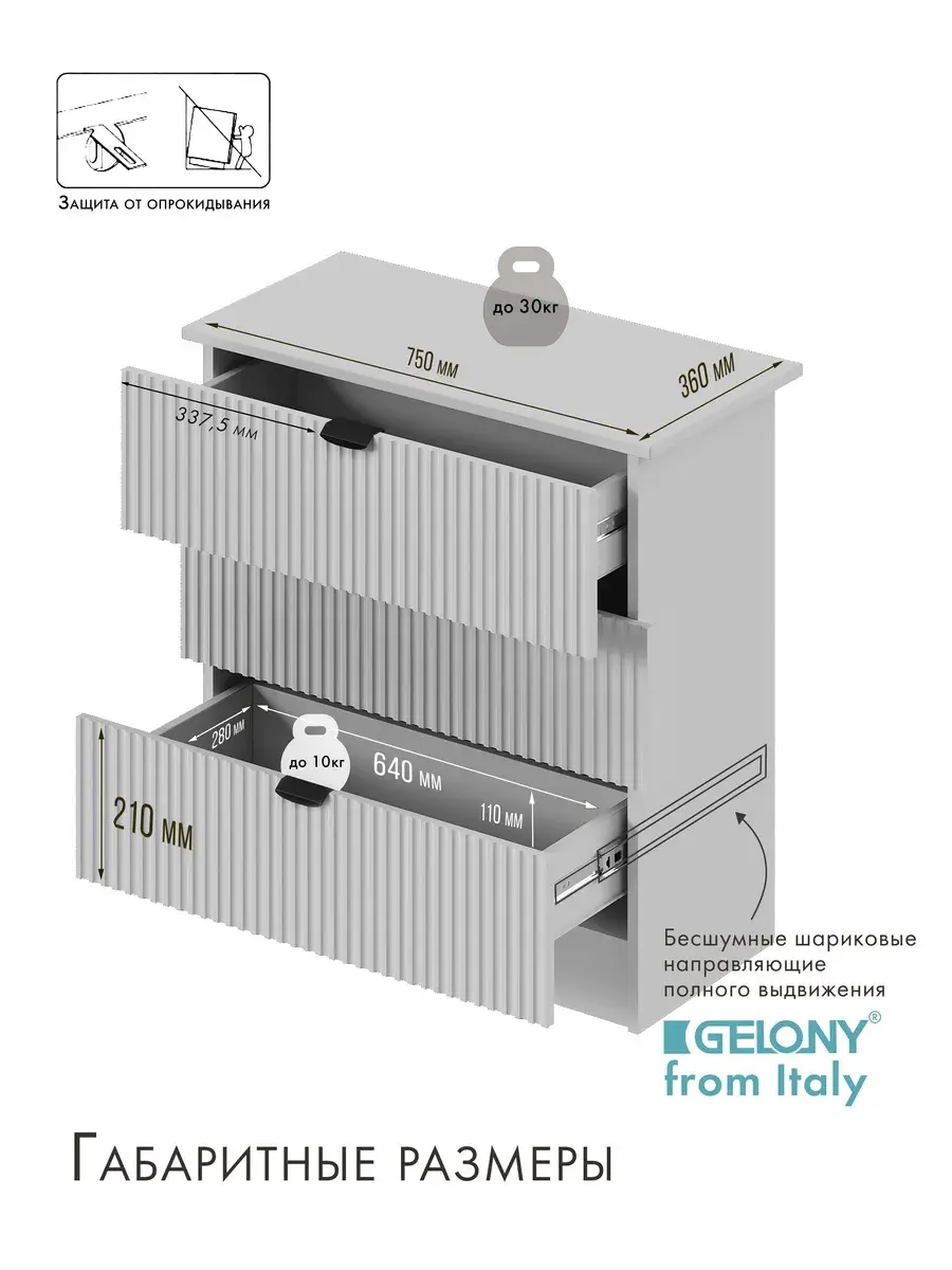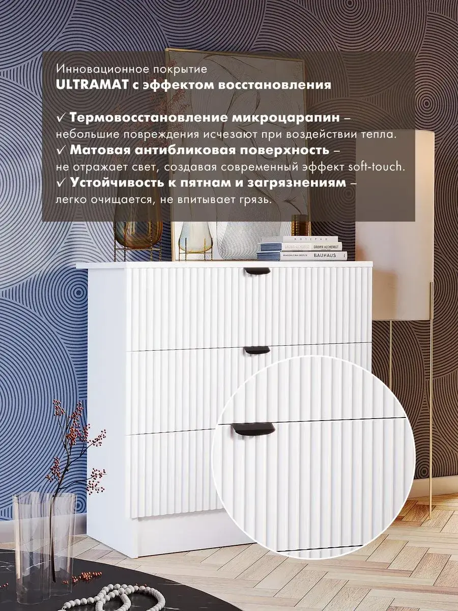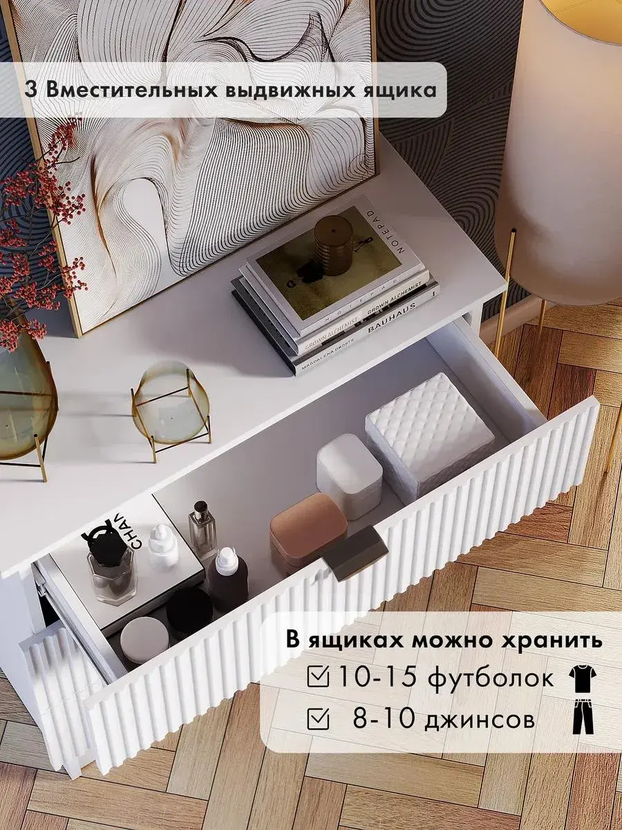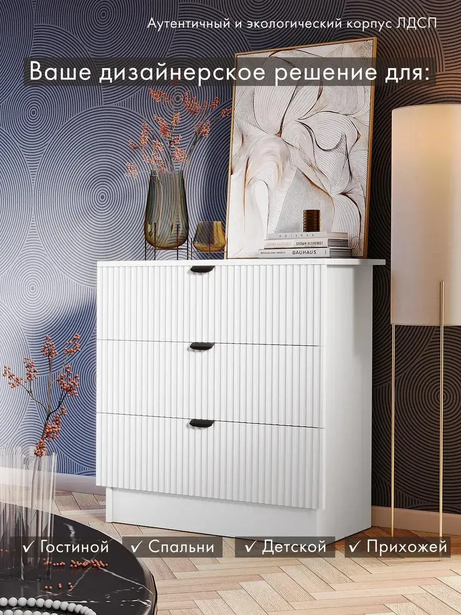 Стильный комод с фрезеровкой и 3 ящиками станет элегантным акцентом в любом интерьере. Камод в стиле лофт изготовлен из качественных материалов с покрытием Soft-touch. Код цвета в системе RAL 9003. Деревянный комод с черыми ручками обеспечит надежное хранение ваших вещей. Благодаря компактным размерам, узкий комод можно разместить в прихожую, коридор, спальню или гостиную.