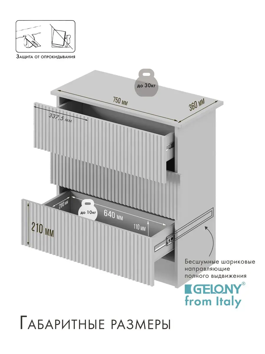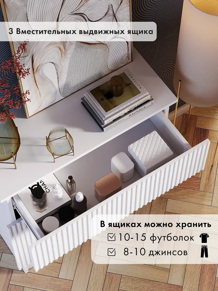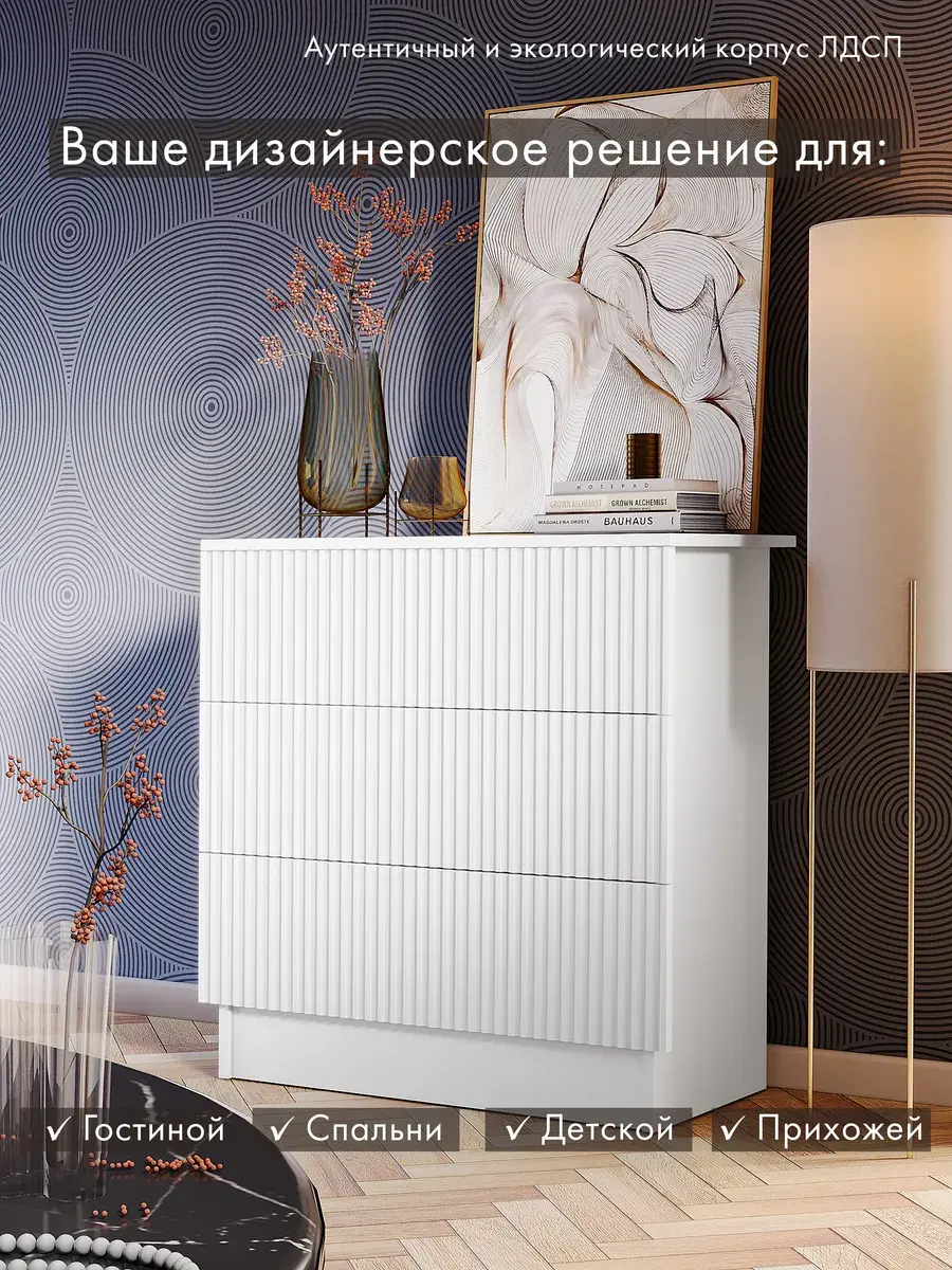 Стильный комод с фрезеровкой и 3 ящиками станет элегантным акцентом в любом интерьере. Камод в стиле лофт изготовлен из качественных материалов с покрытием Soft-touch. Код цвета в системе RAL 9003. Деревянный комод обеспечит надежное хранение ваших вещей. Благодаря компактным размерам, узкий комод можно разместить в прихожую.