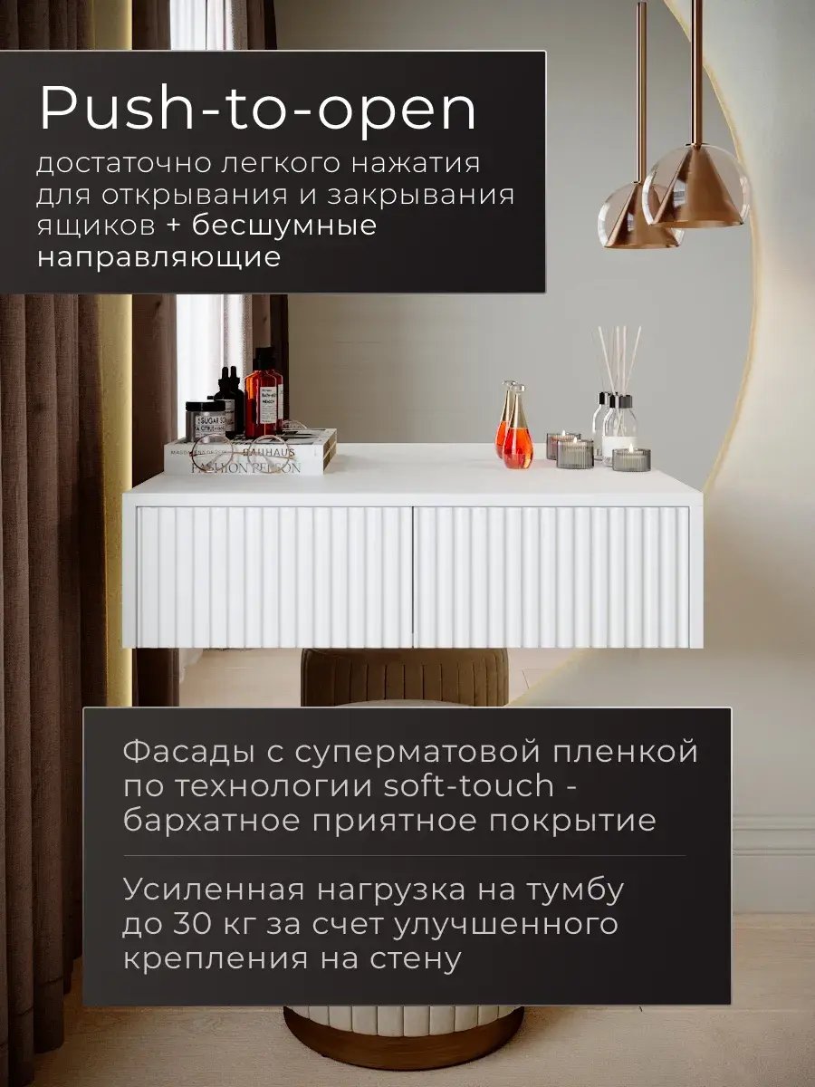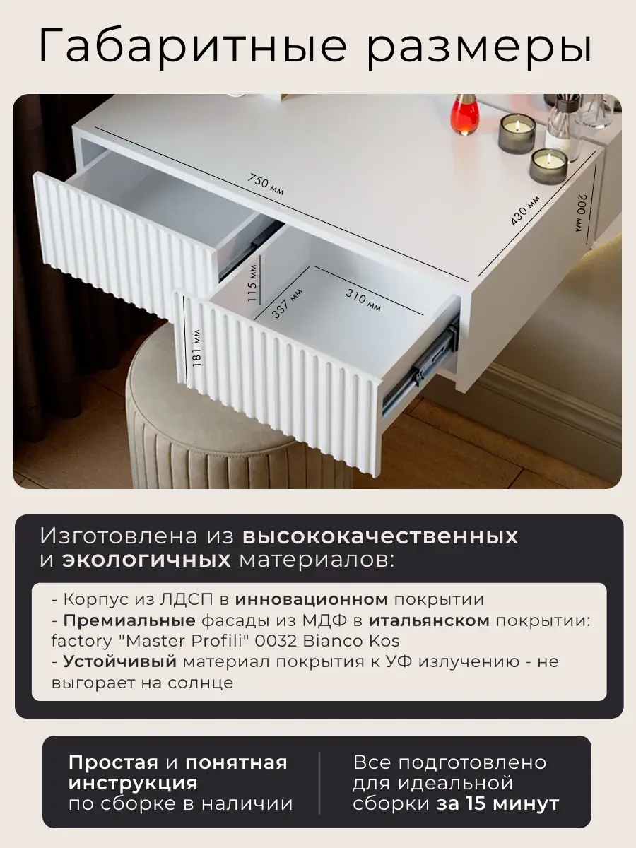 Консольный настенный туалетный столик - создаст удобное пространство для ухода за собой. Косметическая тумбочка сочетает современный дизайн и практичность. Код оттенка цвета RAL 9003. Подвесная консоль оснащена двумя ящиками, что обеспечит хранение косметики и аксессуаров. Трюмо для макияжа украсит спальню, а также тумба подходит в прихожую. Макияжный дамский навесной стол позволит сэкономить место и создать легкий интерьер в комнате. Подвесной косметический столик подойдет для профессионального использования в салоне красоты для бровиста или визажиста.