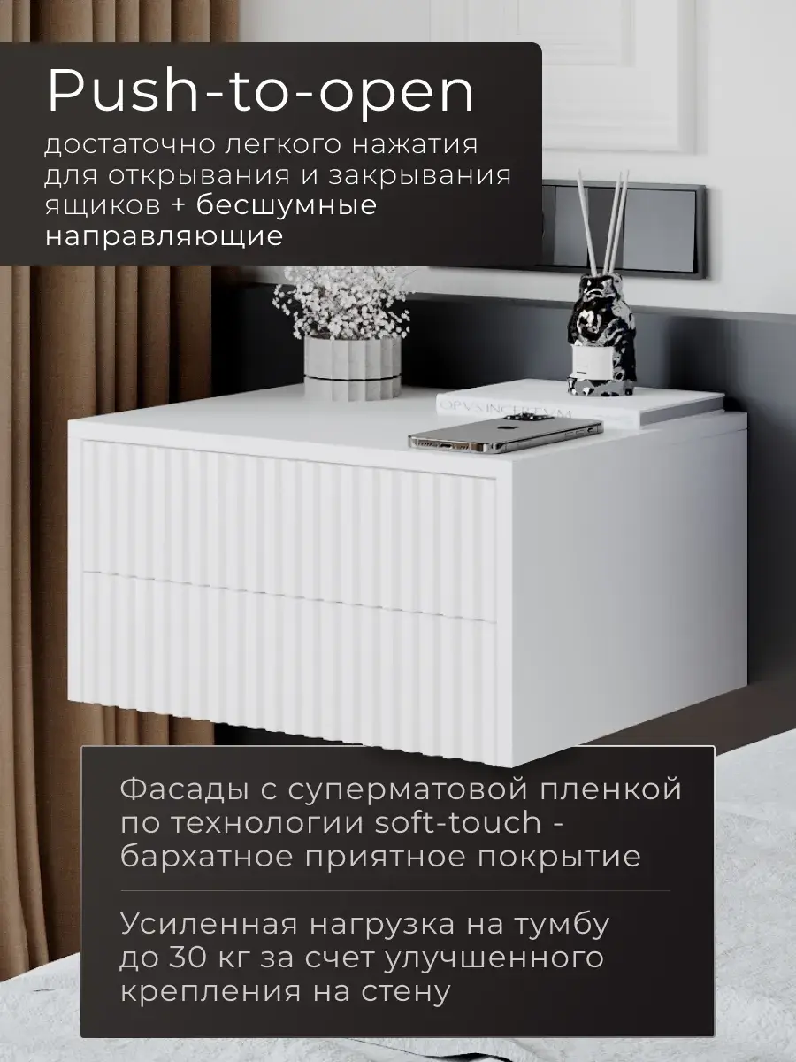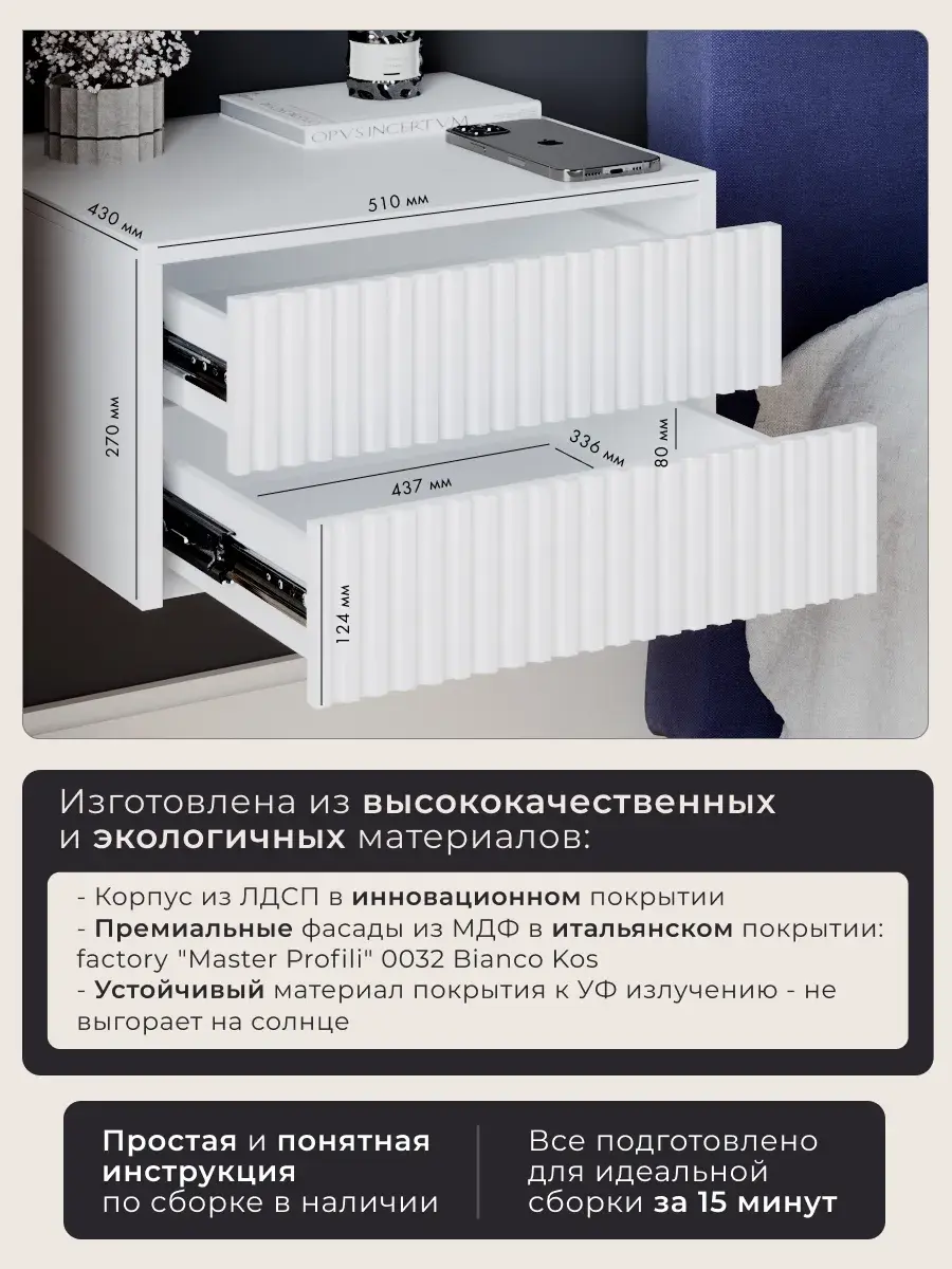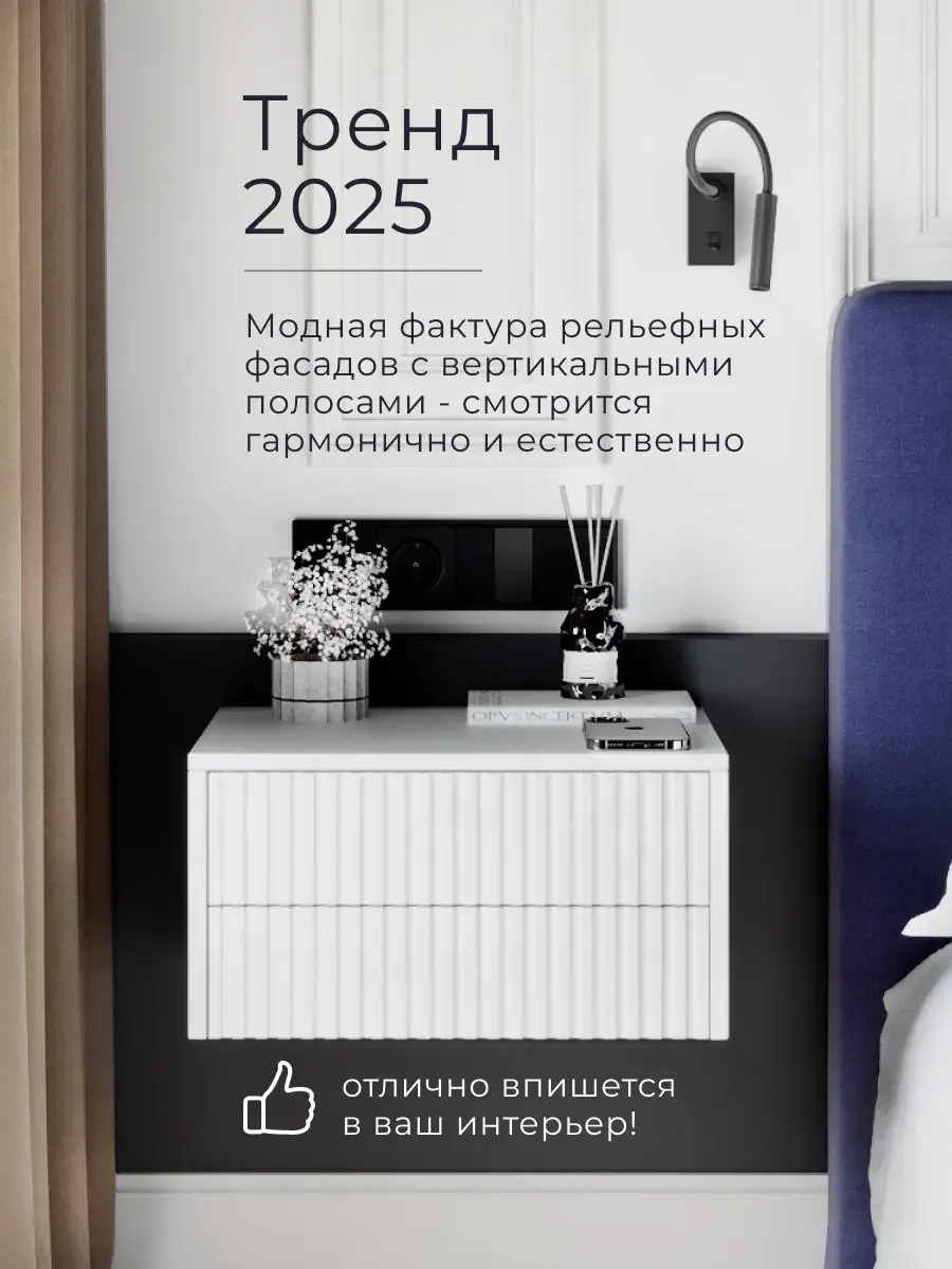 Стильная прикроватная тумба - идеальное дополнение в вашу спальню. С элегантной фрезеровкой и двумя выдвижными ящиками, настенная тумбочка обеспечит удобное размещение мелочей рядом с кроватью. Подвесная конструкция позволяет создать эффект легкости и визуально расширить пространство, что особенно актуально для небольших помещений. Навесная тумбочка выполнена в белом матовом цвете с рифленой текстурой фасадов. Код оттенка RAL 9003. Тумбу можно использовать как консоль в коридор или прихожую, а также разместить в ванную комнату для хранения необходимых аксессуаров. Благодаря универсальному дизайну, консольный стол сочетается с другими предметами интерьера и подходит для различных стилей.